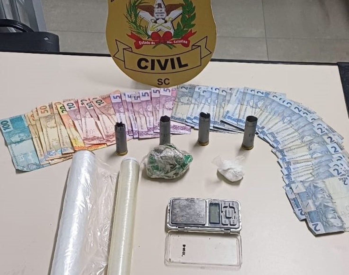 Um jovem de 18 anos, suspeito de ter furtado uma espingarda calibre .12, durante as festividades de final de ano foi preso nesta sexta-feira (17), pela Polícia Civil de Nova Veneza. A ação ocorreu durante uma operação para cumprimento de mandado de busca e apreensão em sua casa pela prática do crime de tráfico de drogas. No local, a polícia encontrou 63 g de maconha e 18 g de cocaína, além de balança de precisão e dinheiro picado.