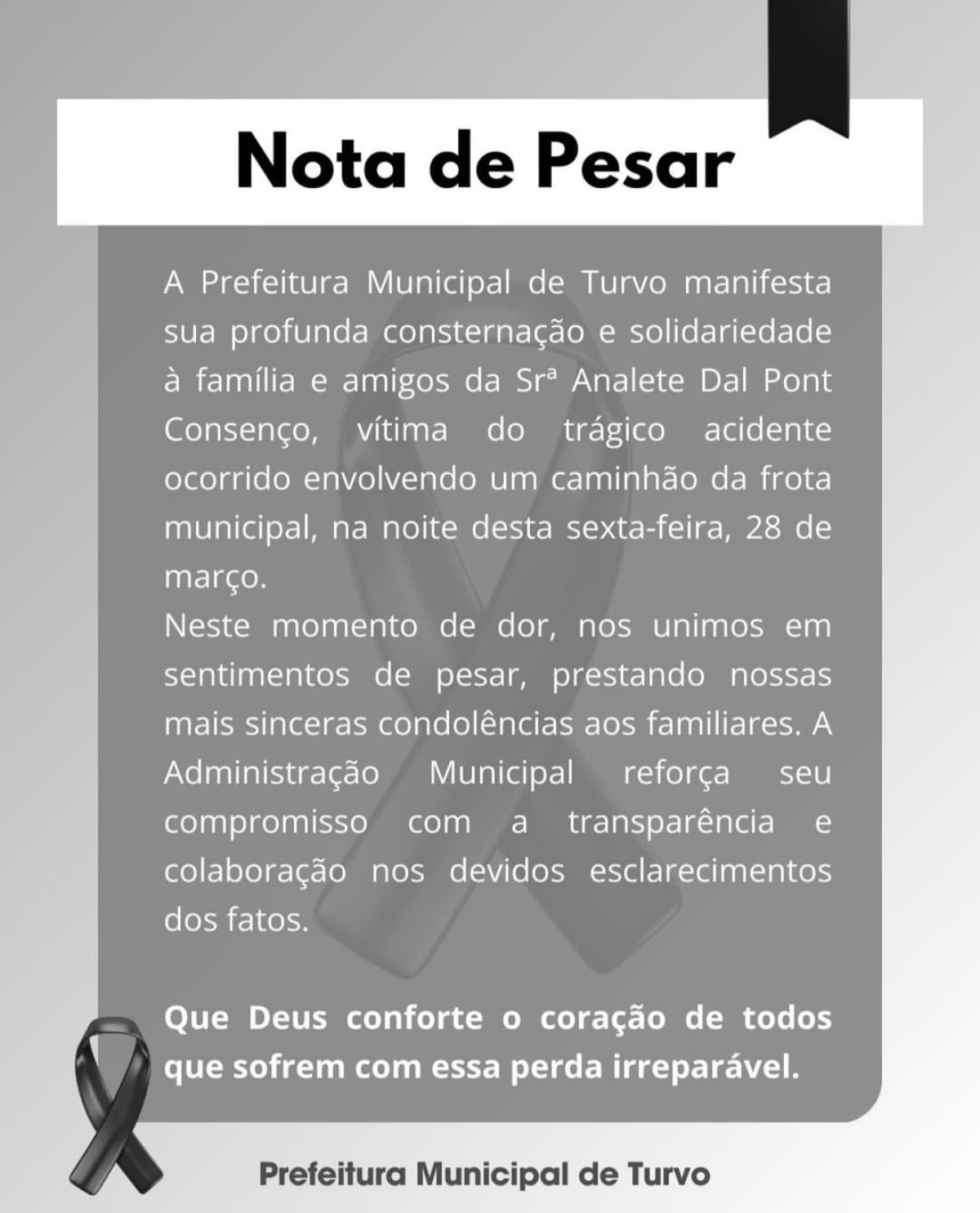 Prefeitura Municipal emitiu uma nota de pesar nas redes sociais em solidariedade a familia e amigos da vítima.