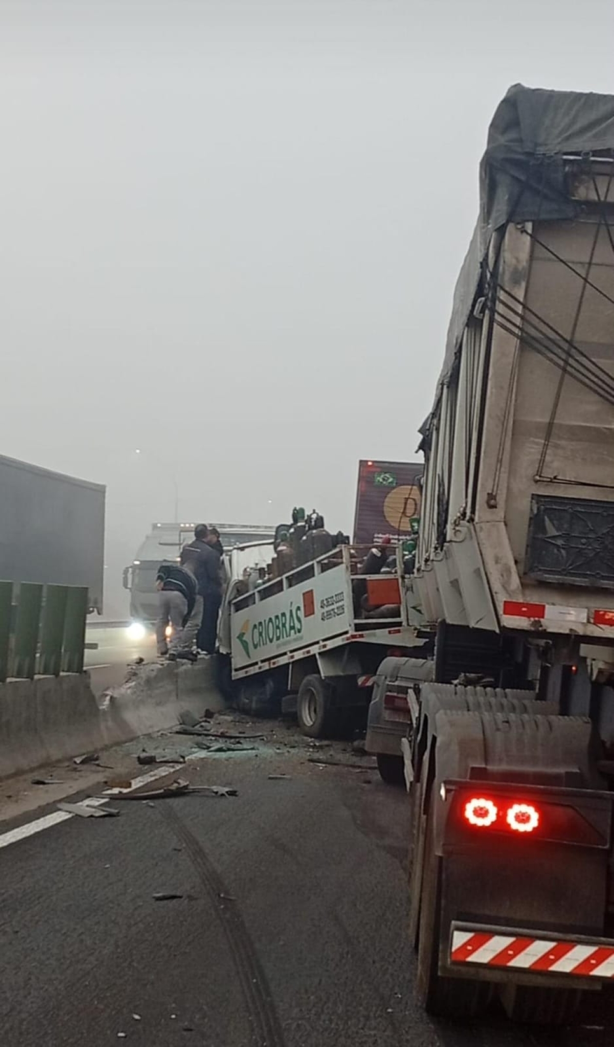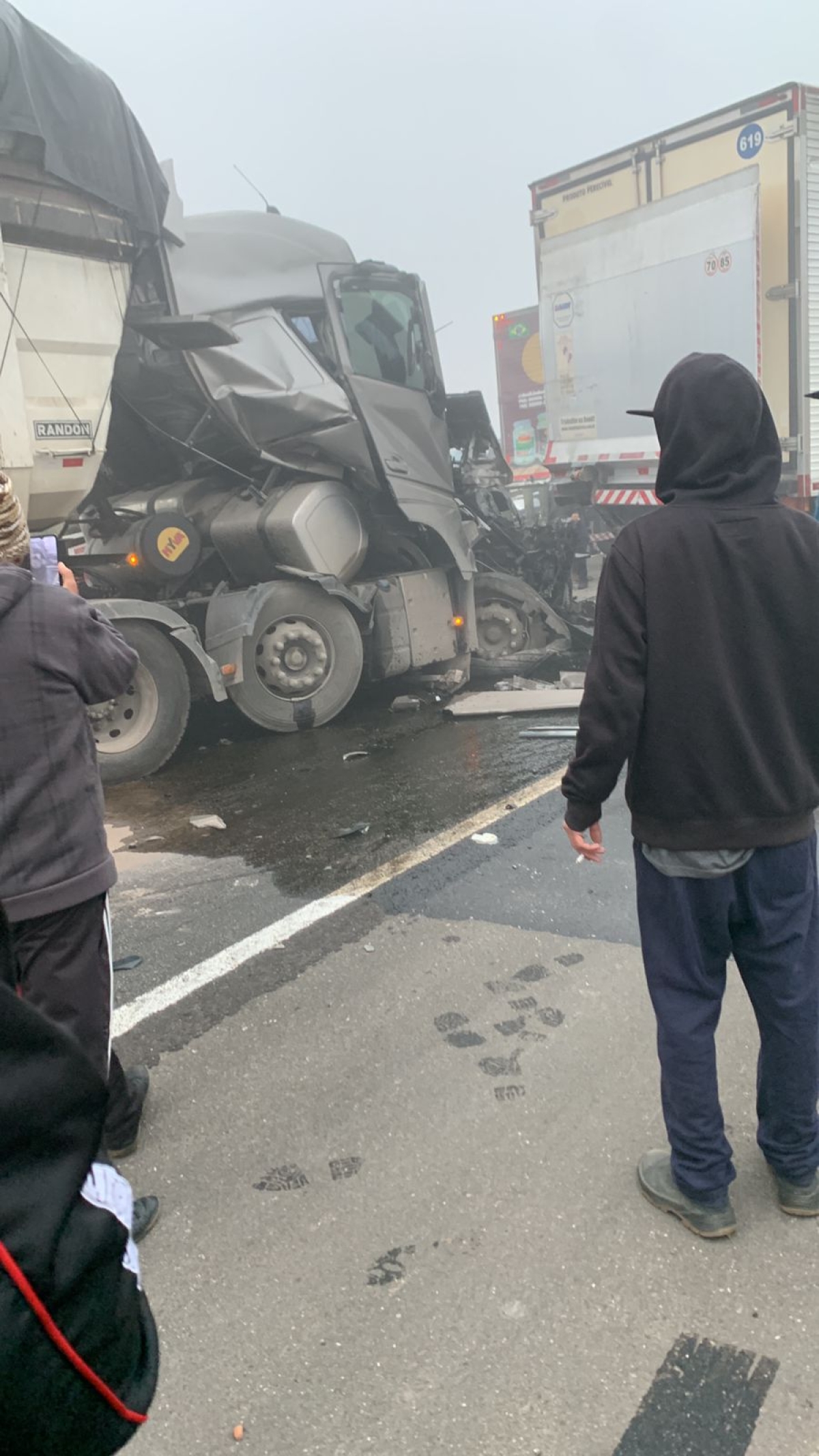 As vítimas estão em avaliação no momento. Ainda não se sabe como iniciou o acidente, mas no local existe uma forte neblina que pode ter atrapalhado a visibilidade dos motoristas. Não há previsão para liberação da rodovia. Em breve mais informações.