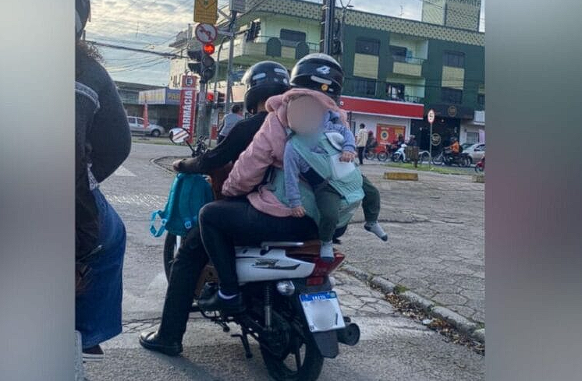 No flagrante feito por outros motoristas na terça-feira (16), o bebê estava preso nas costas da passageira. Enquanto os adultos circulavam de capacete, a criança ficou pendurada como uma “mochila”, virada para a rua.