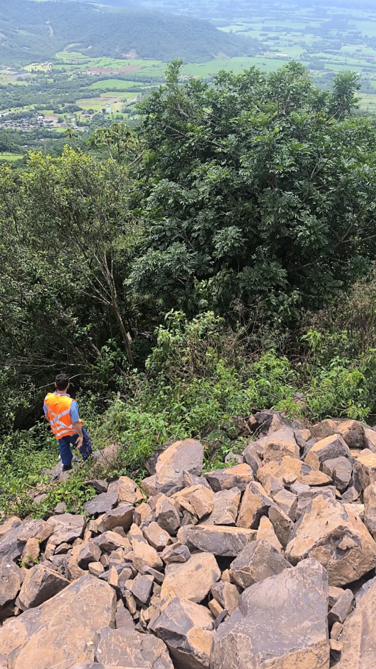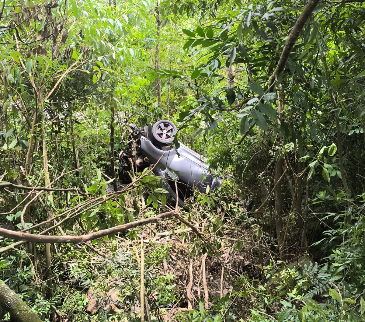 O drone equipado com câmera térmica conseguiu realizar voo hoje e localizou o carro em uma área aproximadamente 20 metros fora da estrada, na Serra do Faxinal, em Praia Grande.