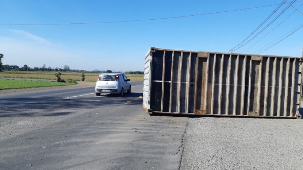 Conforme a Polícia Militar Rodoviária Estadual que atendeu a ocorrência, o motorista não acionou as travas de segurança para prender o container na plataforma, ocasionando a queda. Apesar do susto, não houve feridos.