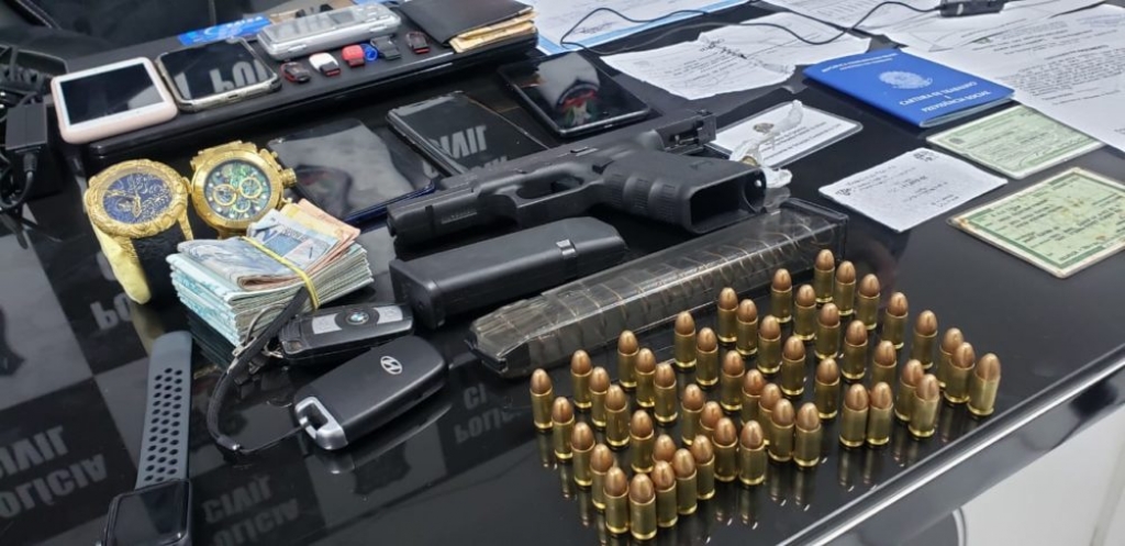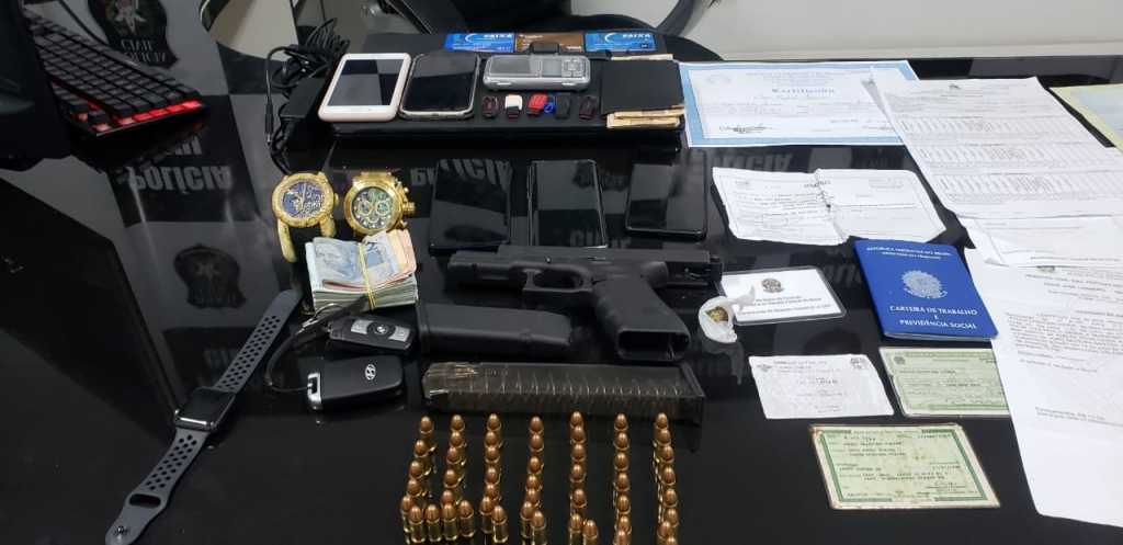 Uma mulher e dois homens foram presos em flagrante e, durante as buscas foram apreendidos documentos falsificados, aproximadamente R$ 8.000,00 em dinheiro, aparelhos celulares, uma pistola .9mm – arma de uso restrito, joias, entre outros objetos.