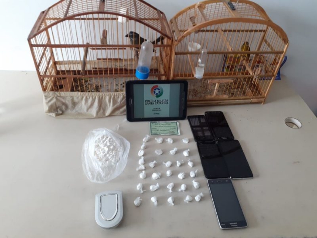Os policiais encontraram e apreenderam dois pássaros silvestres e no quarto, 30 papelotes de cocaína preparados para a venda e mais 98 gramas do mesmo entorpecente, pronta para ser embalada, totalizando 124,8 gramas. Durante os trabalhos também foram apreendidos cinco aparelhos celulares e mais 01 balança de precisão.