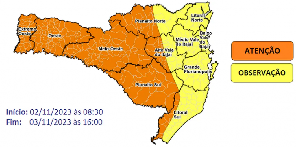 Nesse período, pode chover até 130 milímetros no Oeste, na Serra, em parte do Vale do Itajaí e Sul e nas áreas mais altas do Norte. A média histórica para todo o mês de novembro é de até 190 milímetros no Oeste, conforme a Epagri/Ciram, órgão que monitora as condições meteorológicas de Santa Catarina.