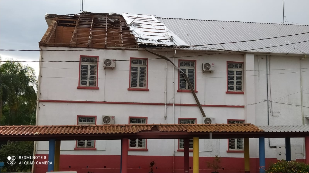 O forte temporal que atingiu a região na tarde desta quinta-feira (24) causou muitos estragos pela região. Em Forquilhinha, além de árvores a ventania também causou estragos em um dos prédios do Colégio Sagrada Família que fica no Centro da cidade.