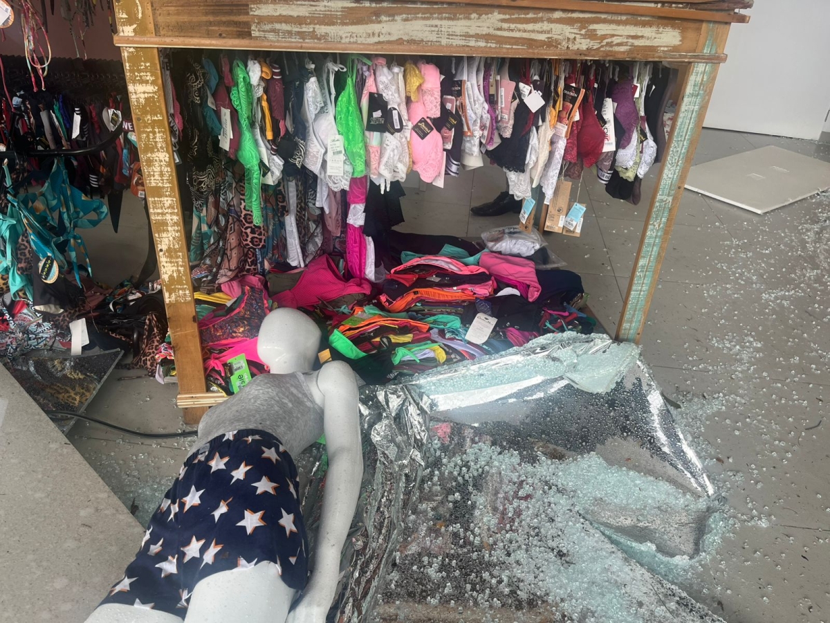 Loja Destak moda íntima também no Centro da cidade, foi bastante atingida, o forte vento quebrou uma parte dos vidros, danificado móveis e molhando mercadorias.