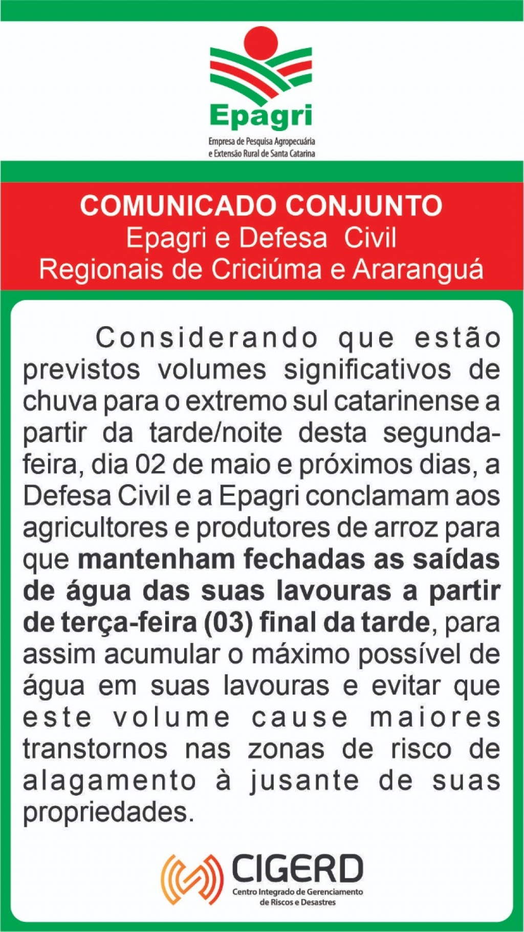 Diante da recomendação dada pelo Colegiado de Defesa Civil da AMESC (Associação dos Municípios do Extremo Sul Catarinense), referente a possibilidade de grande volume de chuva nesta terça-feira (03/05), a rede municipal de ensino de Turvo terá aula apenas nas creches, por estarem situadas na área central do município, com menos riscos de alagamentos. Já estudantes de pré, ensino fundamental I e II terão as aulas canceladas.
