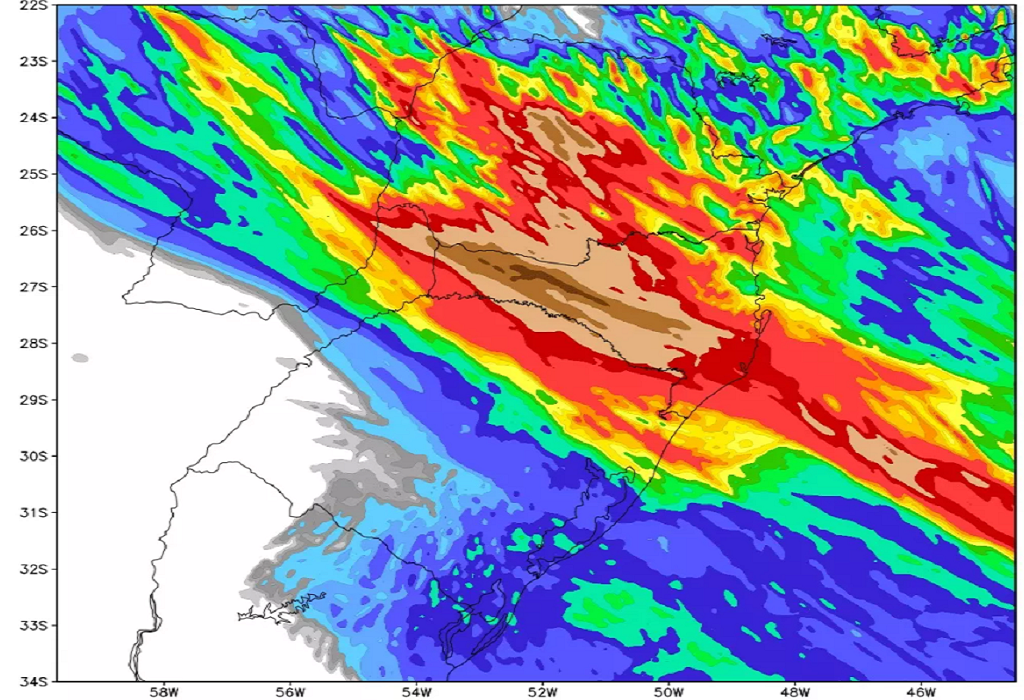 Os volumes de chuva apenas neste início de semana devem superar a média histórica do mês de outubro inteiro em algumas cidades de Santa Catarina e do Paraná. Modelos numéricos projetam a possibilidade de serem registradas marcas acima de 100 mm em muitas áreas do território catarinense e em parte do estado paranaense. As mesmas simulações computadorizadas apontam que diferentes locais de Santa Catarina e alguns do Paraná devem ter acumulados de precipitação ainda mais elevados, de 150 mm a 200 mm em apenas 72 horas. Mesmo acumulados isolados superiores a 200 mm não podem ser descartados.